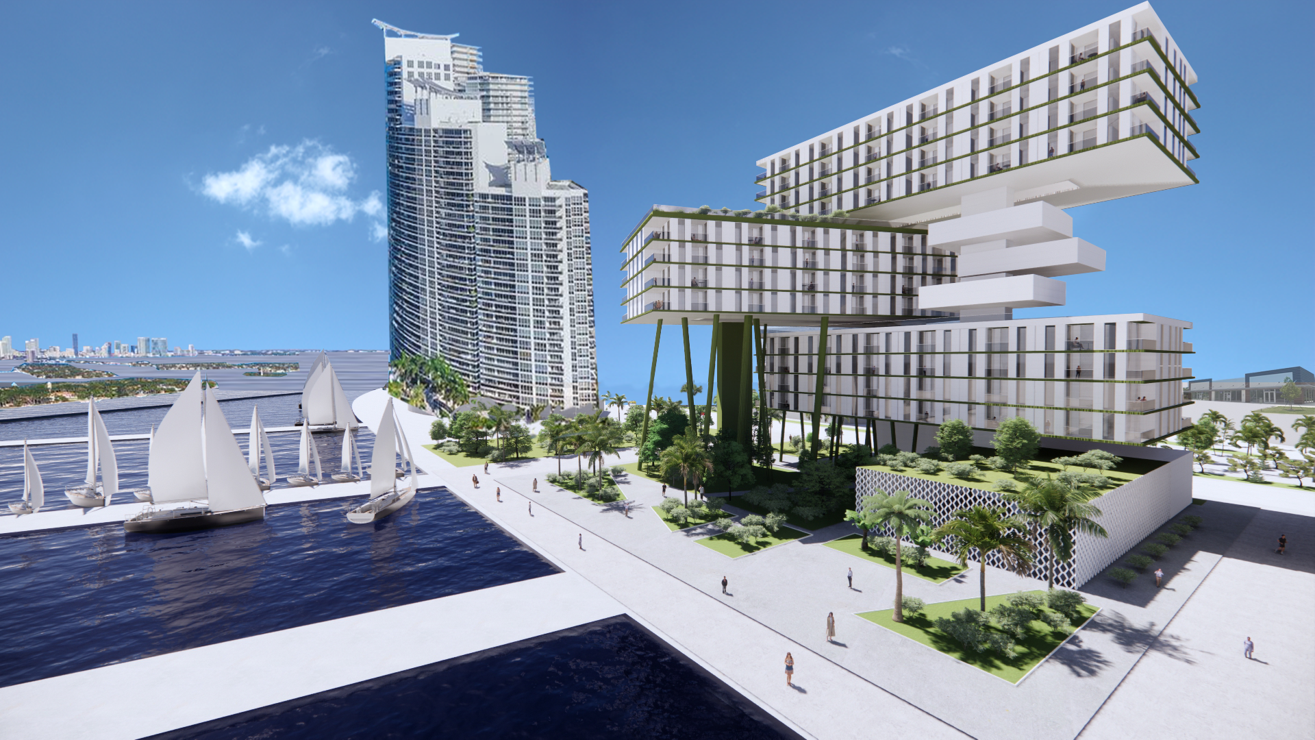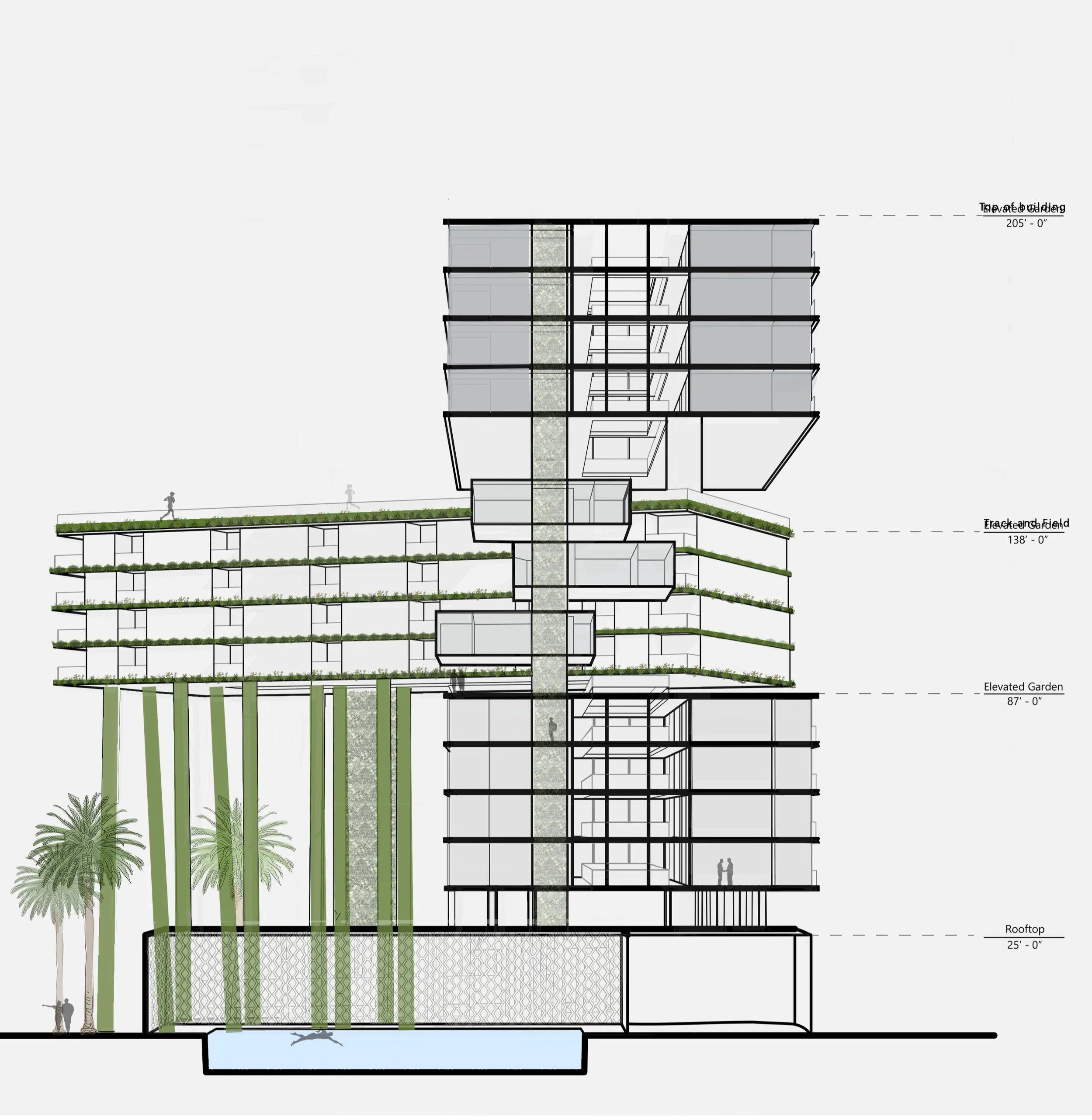 232 Alton’s design and architecture are mainly composed of 3 rectangular double-loaded residential towers, a multi-purpose garden, and an aquatics center. Parallel to Alton Road sets the first tower, which is raised 15 feet above sea level. Above, the second tower is cantilevered and rotated to follow Miami Beach’s historic street grid, while also providing maximum shading and reducing thermal heat transfer to the rest of the complex. Other features such as a low emissivity glazing system allow us to minimize the infrared and UV lights, creating a more controlled environment to live in. On the rooftop level, a running track is located. Our circulation system not only connects the first and third towers but, has private access to meeting rooms available to rent for events.