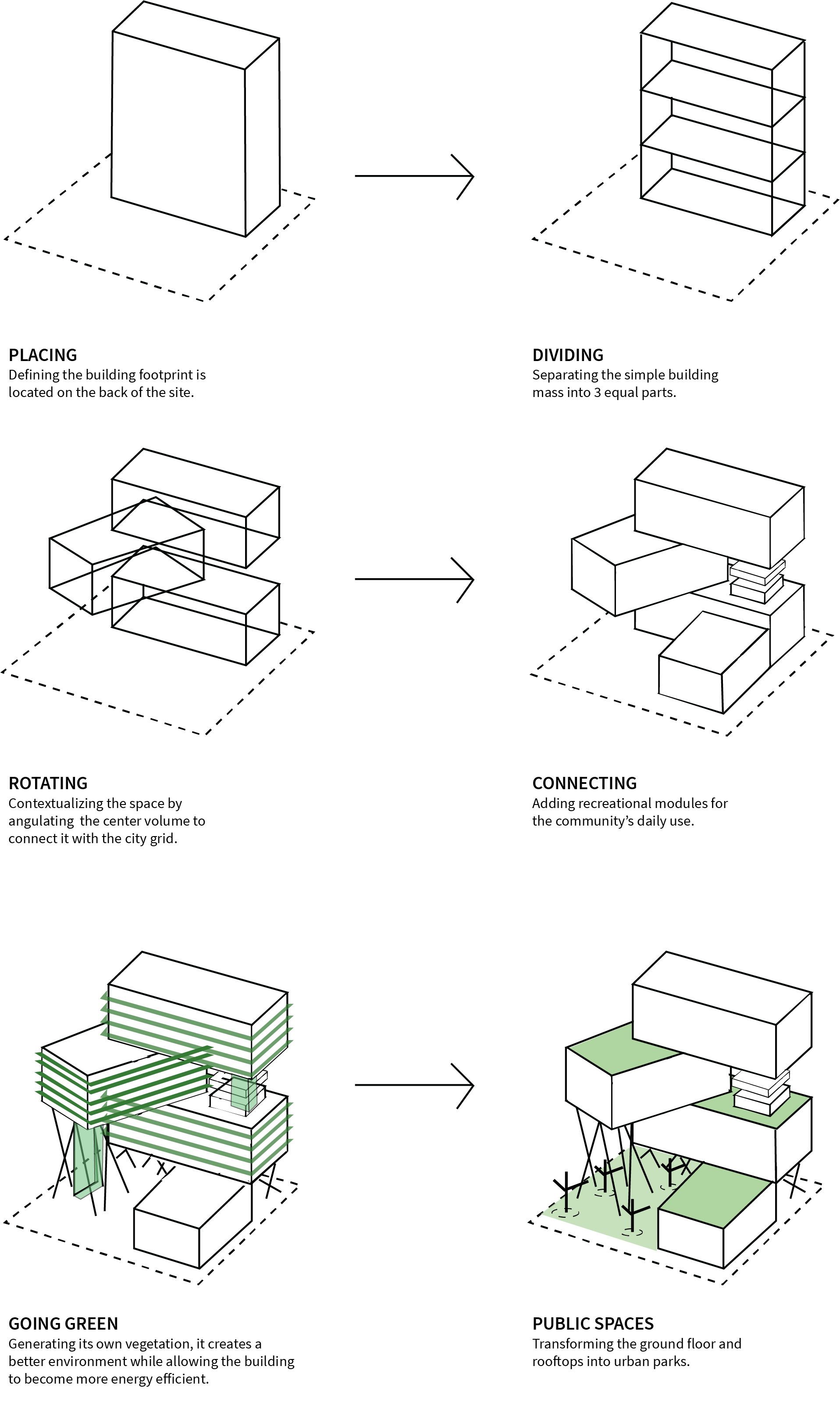 Throughout the project, units were designed to take advantage of the space. Implementing micro-units with their own terraces, allowed us to maximize the number of people that would potentially live there.